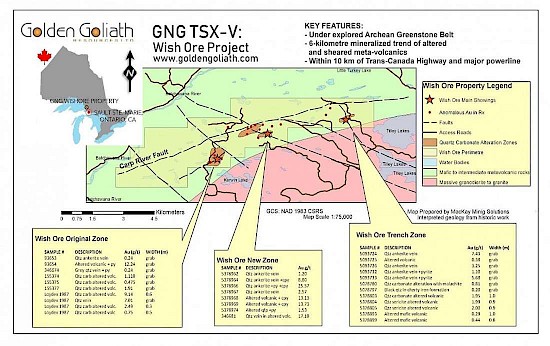 Golden Goliath Resources is pleased to announce that the preparatory work for the preliminary drilling has been completed on its 100% owned Wish Ore project, located 12 km from the Trans-Canada Highway north of Sault Ste Marie, Ontario. The drill and crew arrive on site today.
