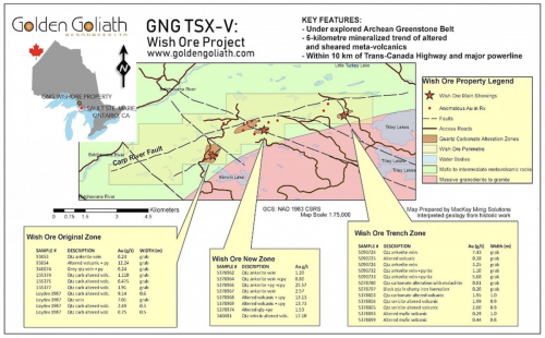 Golden Goliath Resources is pleased to announce that the core samples from the four diamond holes recently completed at its 100% owned Wish Ore project, located 12 km from the Trans-Canada Highway north of Sault Ste Marie, Ontario have now been sent to the laboratory.