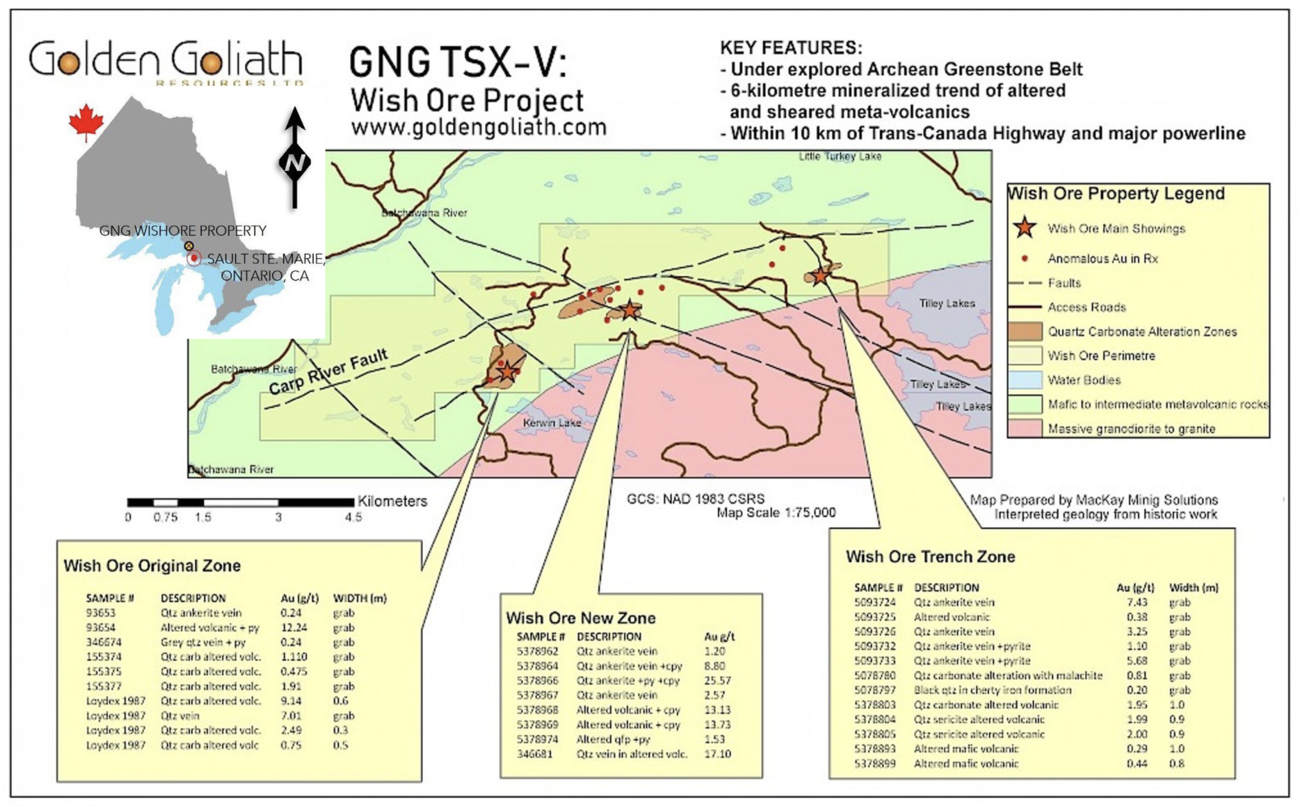 Golden Goliath Resources is pleased to announce that the core samples from the four diamond holes recently completed at its 100% owned Wish Ore project, located 12 km from the Trans-Canada Highway north of Sault Ste Marie, Ontario have now been sent to the laboratory.