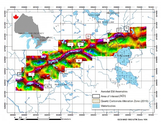 The excellent work by Mr. Diorio has identified 19 Areas of Interest (AOIs) for follow-up. While all of the anomalies look very encouraging, the most exciting of these are AOI 4 and AOI 8 which are located adjacent to known gold mineralization on the property at the Trench zone and the New Zone. AOI 1 and AOI 15 show large-scale potential as they appear to be associated with a 700 meter zone of interpreted flexure along the deep seated Carp River fault and the intersection of a northwest trending structure. AOI 13 is also an anomaly near the junction of the Carp River Fault and a northwest trending structure. Prospecting in 2019 identified large angular mineralized boulders 200 meters down ice southwest of this anomaly. In the underexplored southwest end of the property AOI 7 consists of an anomalous northwest trending mag low which cuts three east west trending mag highs. The area of the mag low is associated with VLF conductors and interpreted structures. This is interpreted to represent an area of alteration where magnetic minerals were destroyed by the alteration similar to what is seen in the areas of intense quartz carbonate alteration elsewhere on the property.