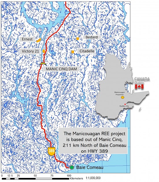 “Golden Goliathʻs Manicouagan project also has a huge infrastructure advantage over many other REE properties. Specifically, there is a major paved highway (HWY 389) that leads from the Saint Lawrence River at Baie Como and extends right between our four properties. Logging roads afford direct road access. But it is the reason why the Highway was built that gives us another very important advantage, which is abundant Hydro power. The highway was built for the construction and running of the Robert Bourassa hydro dam, which is located about 20 kilometres south of the Victory 21 property at the small town of Manic Cinq, where there is a motel and other amenities including an airstrip. Access and infrastructure is excellent and greatly lowers the threshold discovery needed for development. I feel that this project has great potential and that our application of good geoscience and our very straight forward exploration approach will result in exciting targets for the next stage drill program, which could come in late summer and fall.”