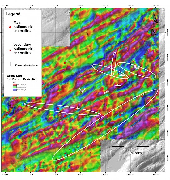 Figure 2 presents the Ernest radiometric map with overlaid Total Magnetic Intensity contours, and principal and secondary anomalies (red dots). The combined data plot shows similarities in orientations between measured attitudes of pegmatitic dykes (strike/dip symbols), and broad trends in the radiometric product (anomalism + high background zones) which are highlighted by the white elipses. This may suggest a common array of geometric controls. Additionally, a generic, large-scale spatial correlation between the radiometric features and the marginal zones, particularly the south margins, of the magnetic features further suggests potential for radiometric target distribution to be controlled by lithological contacts, potentially for rheological reasons. (see Figure 2). First and second vertical Mag derivatives were also compiled in a similar matter.