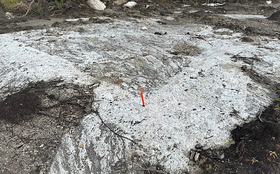 Figure 3 is a photo of a several metre wide angular block of basement gneiss contained within a large pegmatite body on the Ernest property. This feature may be a rim zone result of the Manicouagan impact event. The crust (basement gneiss) was melted for several thousand metres at the centre of the impact but the rim zone would have been intensely fractured and broken. The volatile phase, a combination of the melted meteor and crust material, would have been injected into the fractured rim zone. This may be a picture of the resulting chaotic lithologies.