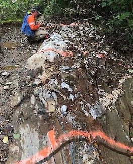 {The prospector} said there was no sign of any past work on this showing that was exposed by the logging company and most of the recorded work was west of here around the Loydex trenches. As well there are several parallel zones here that have not been cleaned off…very exciting.