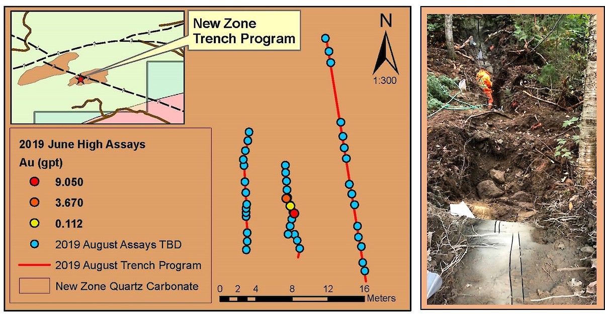 Values of 4.28 g/t gold over 3 meters including 9.05 g/t gold over 1.0 meter were identified from channel sampling on the New Zone. Now, Phase 2 mechanical stripping has revealed that the initial sampling did not include the entire zone of mineralization and subsequent sampling, which has already been completed, may reveal a wider mineralized zone than first anticipated. The Company awaits the assays. The gold mineralization was found to be associated with volcanic rocks with quartz veining and carbonate alteration. Low concentrations of sulphides and chalcopyrite mineralization were also noted.