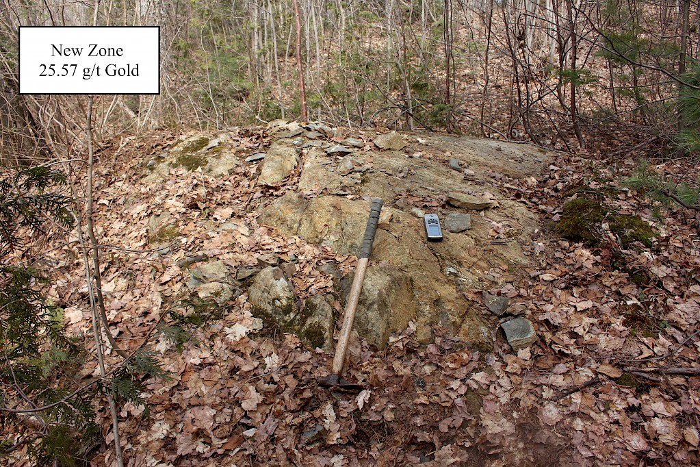 Several new shear zones were discovered on the property by prospector Mike Tremblay in 2013. The most promising of these was a new silicified zone in mafic volcanics south of the Carp River Fault from which grab samples assayed 1.2, 2.57, 8.8, 13.13, 13.73 and 25.57g/t gold. The shear zone is at least 30m wide, runs east-west and consists of silica, ankerite and sericite alteration. The best gold values were from a quartz-ankerite-pyrite +/- chalcopyrite vein that is at least 1m wide. Mineralization was also identified south of the fault zone associated with quartz-ankerite-pyrite stringers in a quartz feldspar porphyry assaying 1.53 g/t gold.