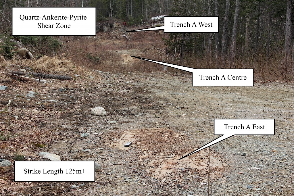 All four holes intersected sheared and altered mafic to intermediate volcanics with variable amounts of intermixed meta sediments restricted to the Trench Zone. The New Zone has shown encouraging quartz veining structures consistent with the ones mapped in the historical work, with sulfide content varied from trace to 5% associated with silicification and quartz carbonate alteration. The holes in the Trench Zone revealed interesting folded sections, with quartz carbonate veining in the hinge zone vicinities returning anomalous gold values, as well as deformed quartz chlorite carbonate veins associated with chalcopyrite mineralization.