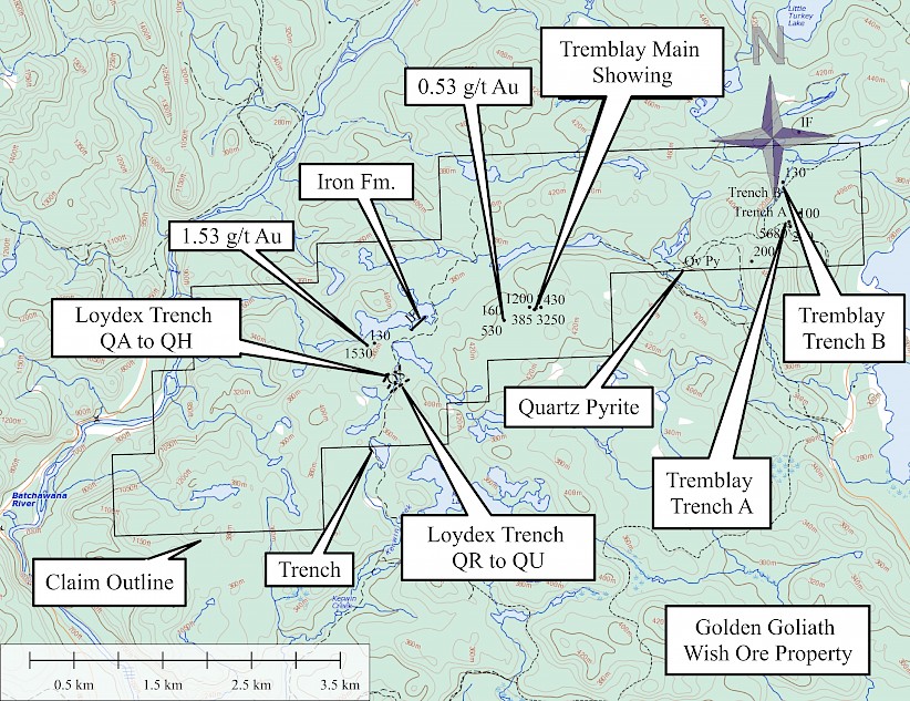 Mr Berniolles concluded that two trends of mineralization and anomalous gold values have been located on the Wish Ore property. The northern trend adjacent to the northeast trending Carp River fault is associated with sheared and iron carbonate altered intermediate to mafic volcanics in contact with banded iron formation. The southern trend is parallel and hosts the high strain zone with associated quartz iron carbonate alteration of the intermediate to mafic volcanics. High gold values identified previously seem to occur localized within these two trends. Based on the geological mapping we believe there are previously unrecognized structural controls associated with the high gold values.